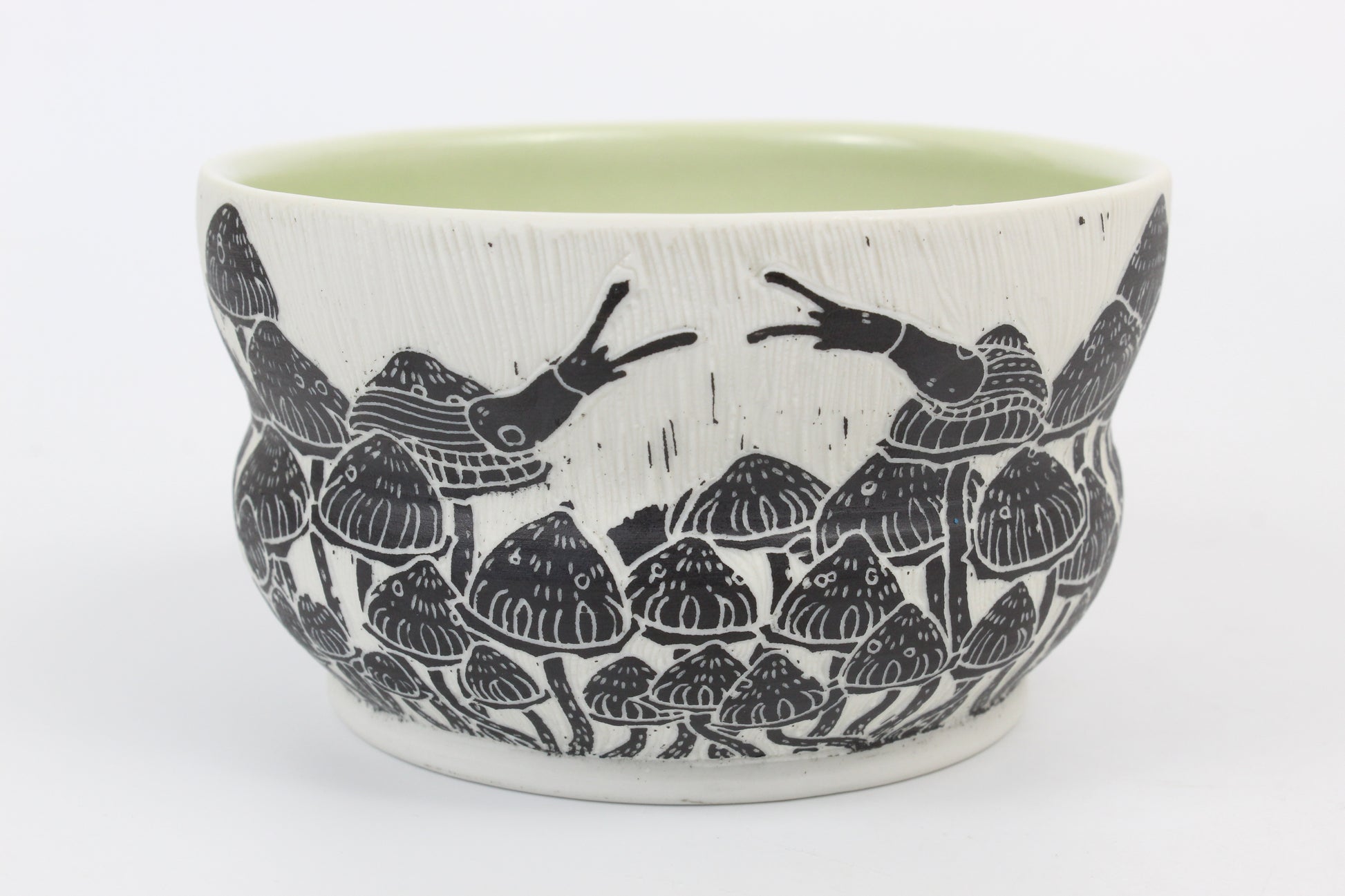 Wheel thrown then hand carved using a Sgraffito technique. Inspired by the forest floor and the little surprises you find! Porcelain is an amazing and a beautiful material to work with, most pieces are translucent in sunlight.