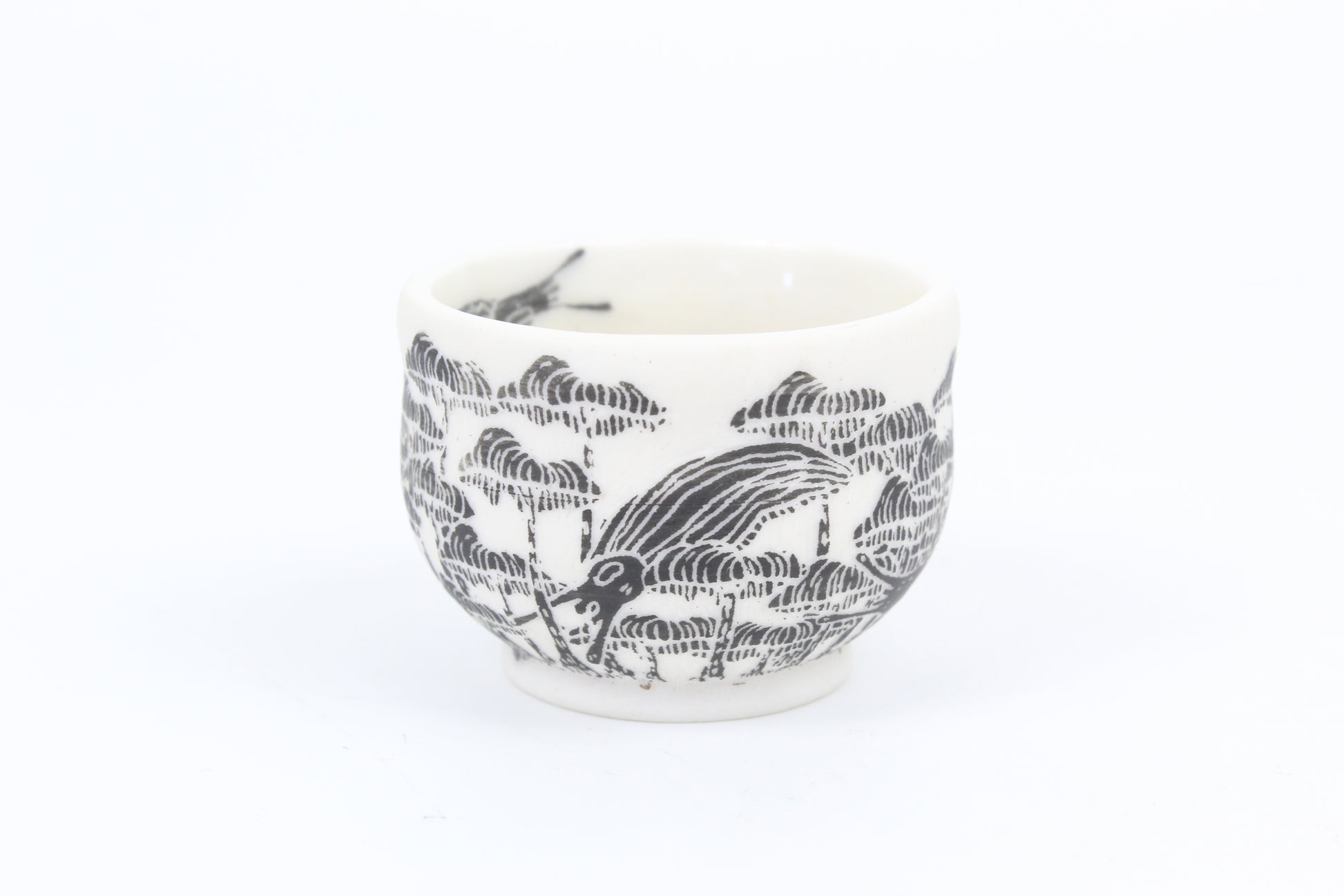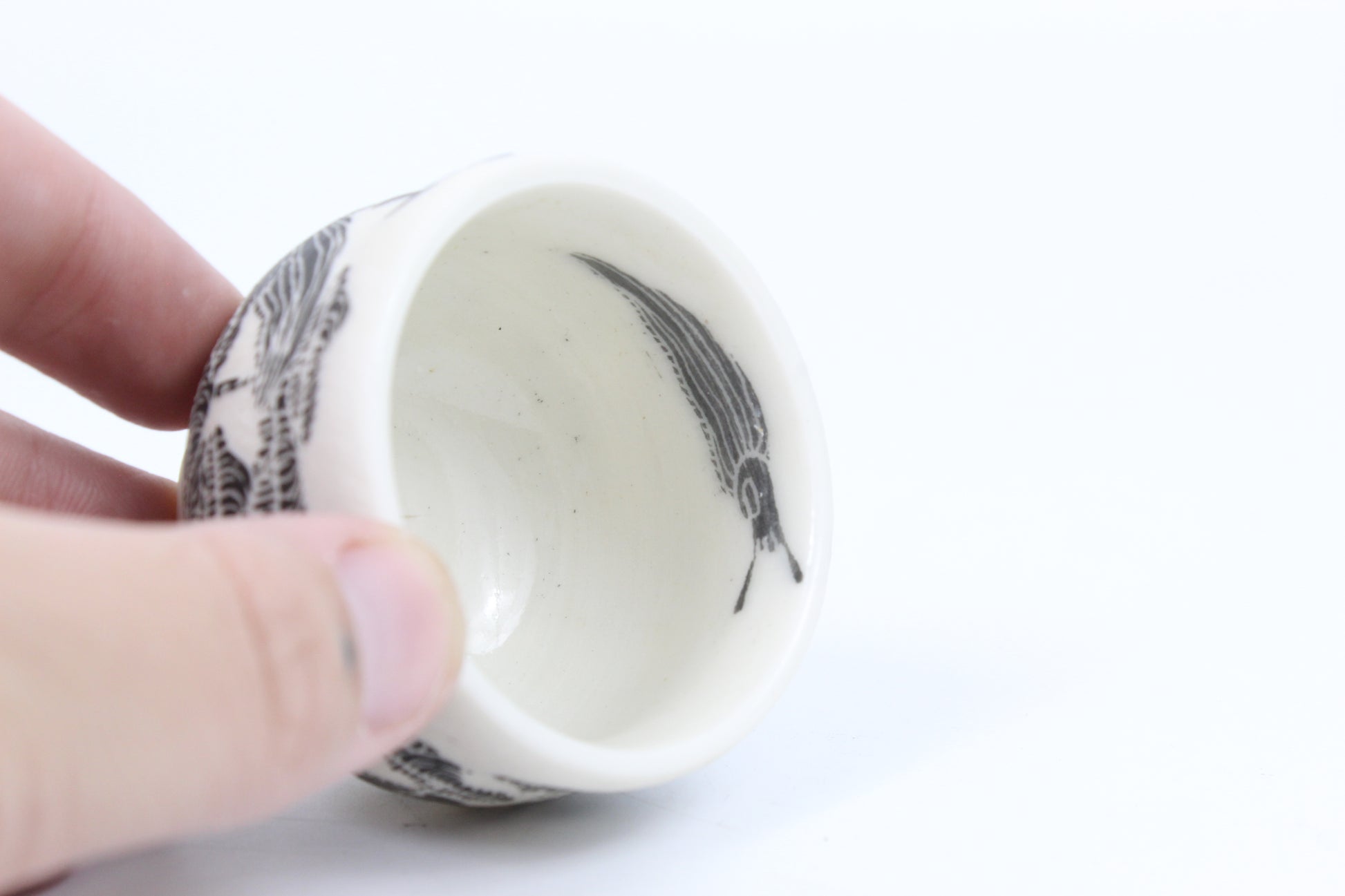 Wheel thrown then hand carved using a Sgraffito technique. Inspired by the forest floor and the little surprises you find! Porcelain is an amazing and a beautiful material to work with, most pieces are translucent in sunlight.